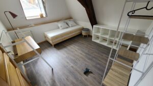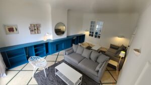 Ameublement complet, création d’un linéaire de rangements sur mesure en utilisant d’anciennes bibliothèques. Equipement complet.